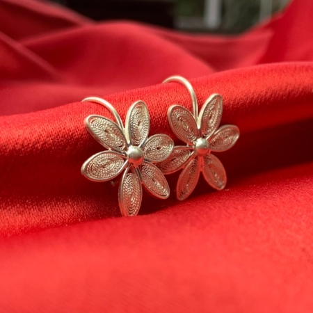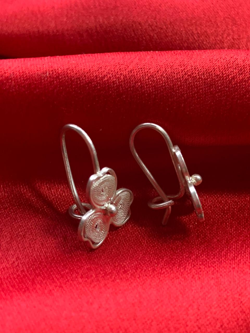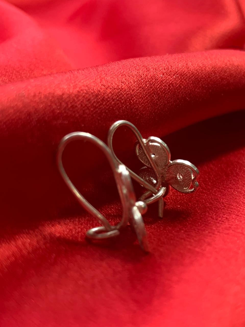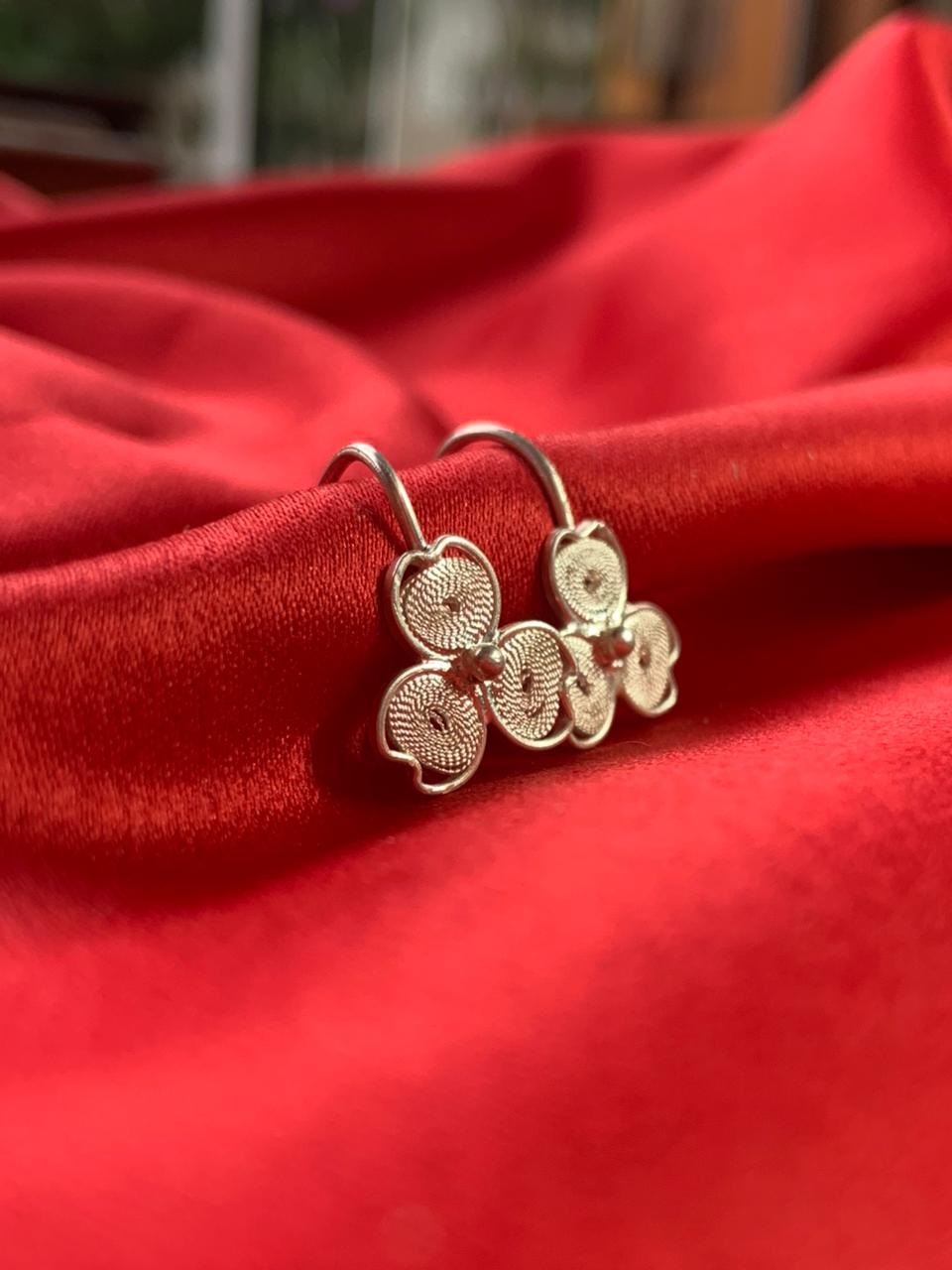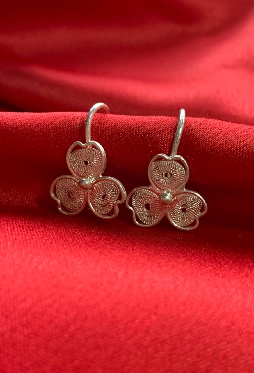 Brinco Trevo feito em prata 950 na técnica da filigrana, com design formado por três pétalas entrelaçadas. Cada círculo é minuciosamente preenchido com finíssimos fios de prata que criam uma textura rendada e cheia de luz.